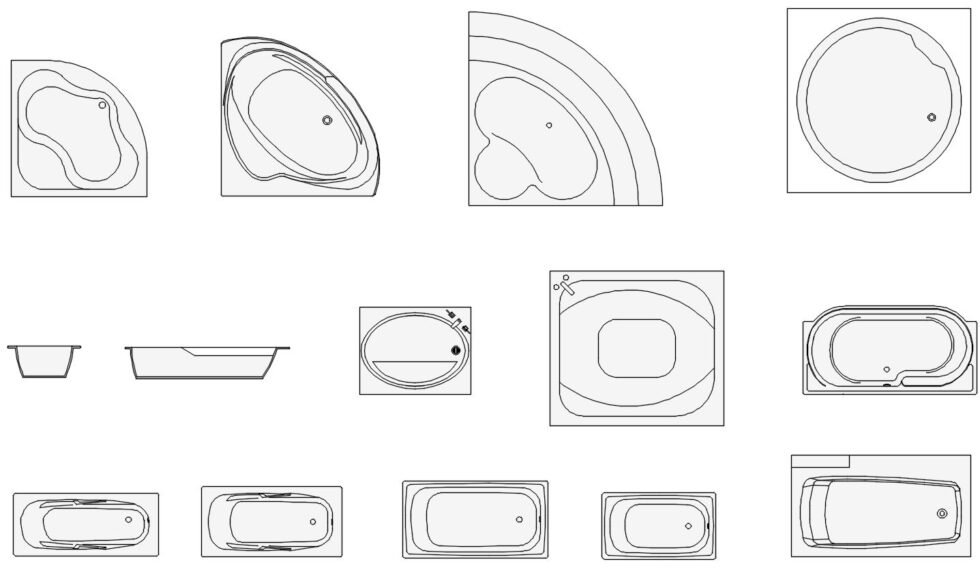 The file includes both plan and elevation views. As a result, you can document bathtub installations at different scales and drawing stages. The plan symbols cover freeform shapes, compact units for small bathrooms, soaking tubs, and models with visible faucet fittings. In the elevation views, you will find clear side profiles that fit common architectural conventions.