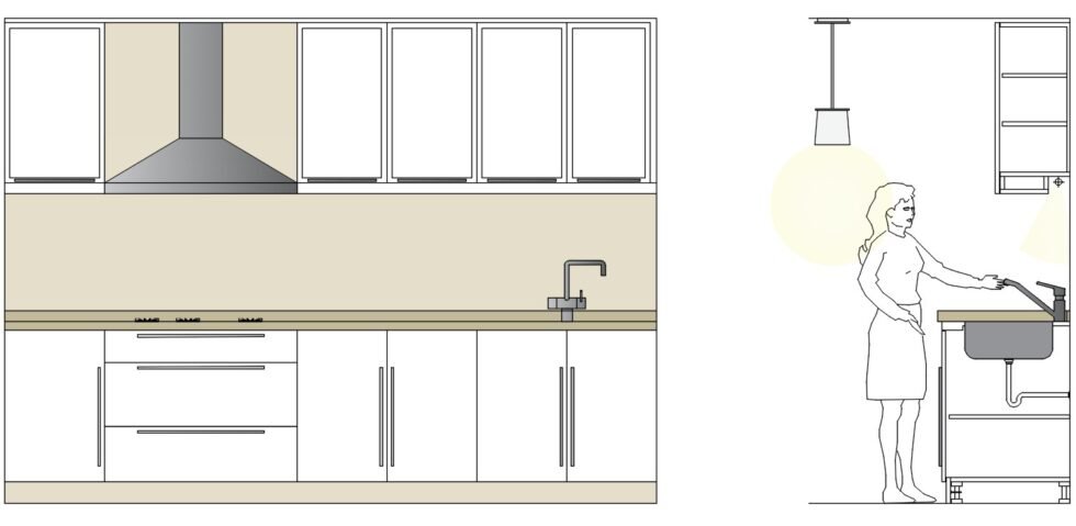 Download a detailed kitchen elevation and section CAD drawing featuring a modern layout with cabinets, sink, and range hood. This file includes a complete front elevation and a side section focused on the sink area, ideal for architectural and interior design projects.