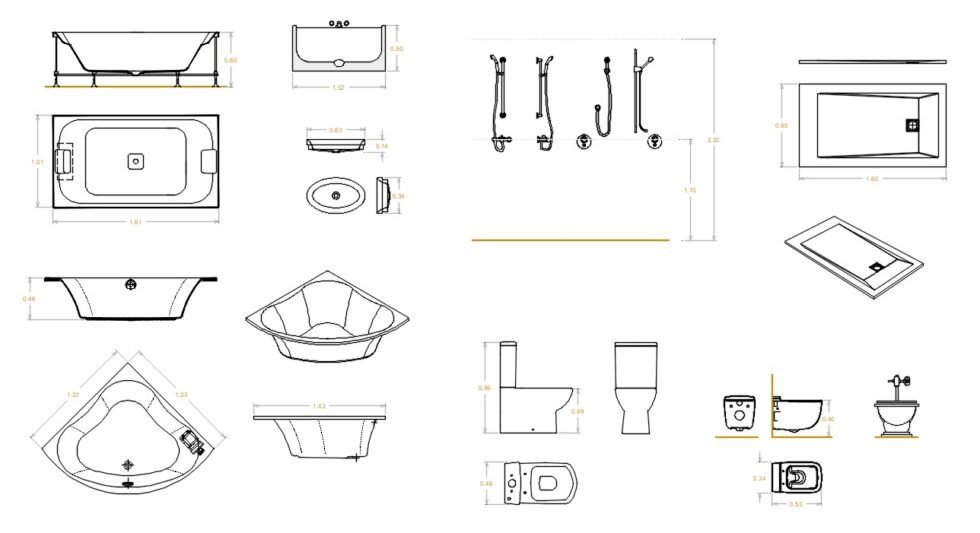 Download a complete bathroom fixtures CAD block set in DWG format, developed for architects, engineers, and interior designers. This collection includes precise metric and imperial dimensions, optimized geometry, and clean layer organization for seamless use in AutoCAD and other CAD platforms.