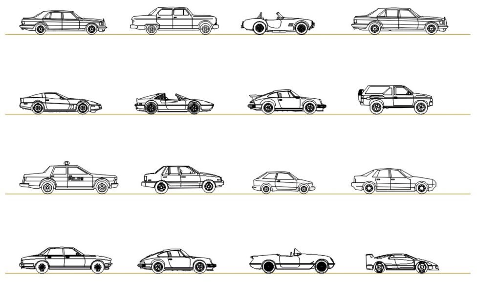 The library includes different types of cars represented in side elevation for accurate scale and clean integration into CAD projects.